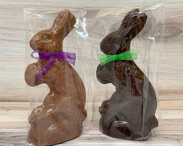 Solid Chocolate Standing Bunny holding Egg with Jelly Beans in the basket in Milk or Dark Chocolate. This bunny has a flat back.